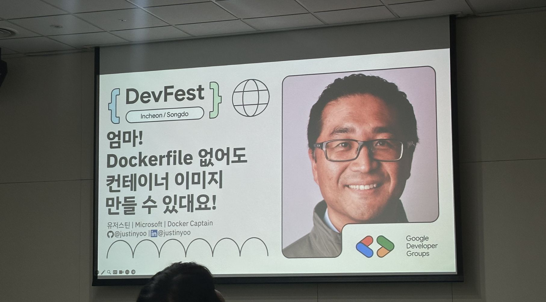 첫 세션은 Microsoft사의 유저스틴 연사자님의 '엄마! Dokerfile 없어도 컨테이너 이미지 만들 수 있대요!'.