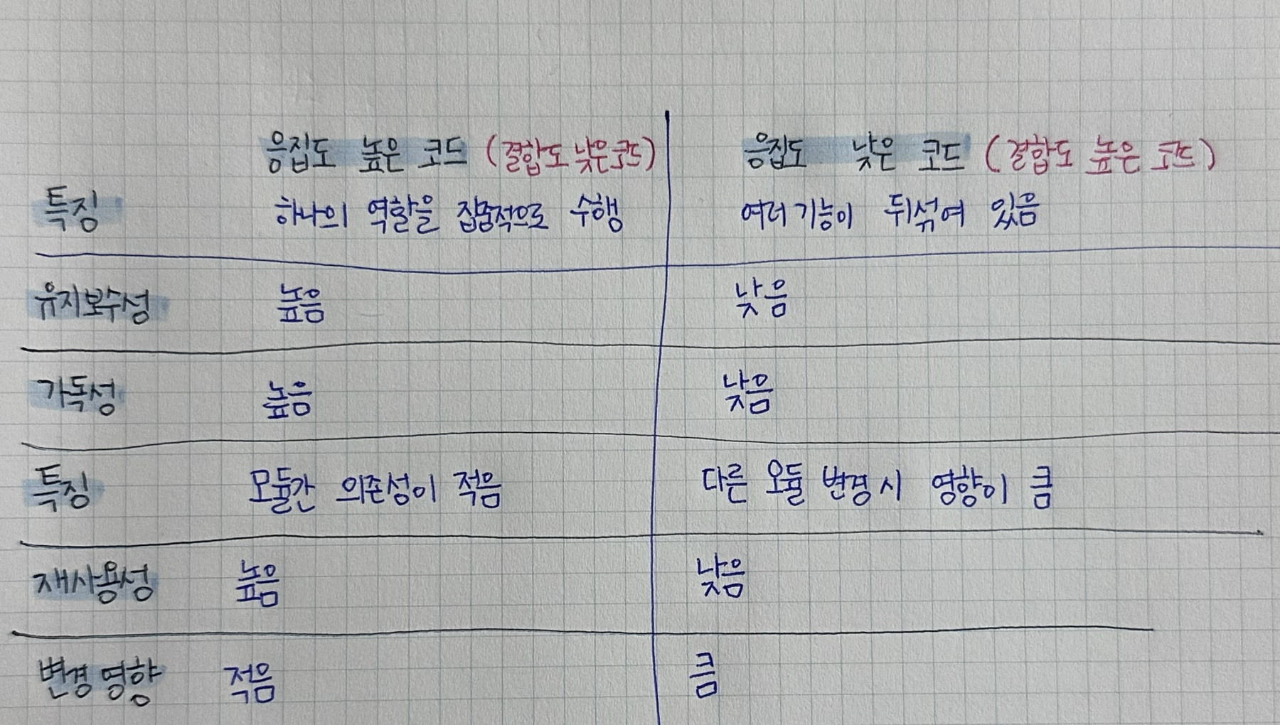 높은 응집도 = 모듈 내부의 기능이 하나의 목적을 위해 강하게 결합